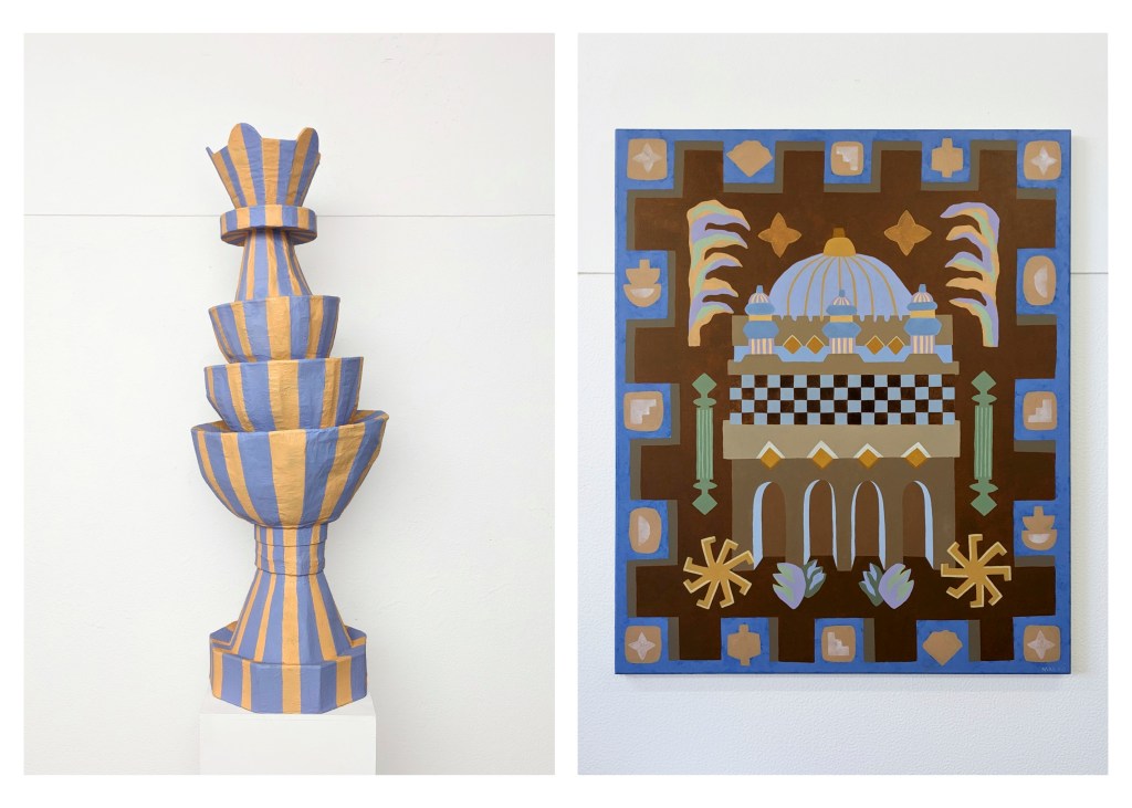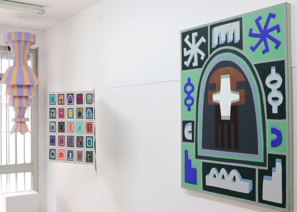 Through a series of acrylic paintings and paper sculptures, the artist invites us into her world of icons and totems to be worshipped. This collection of brightly colored works, with their architectural motifs and repeated symbols, bears witness to the artist’s own mythological language. Using the particularities of space, the artist evokes the atmosphere of rites and sacred practices, and stages works that demand to be felt more than understood.