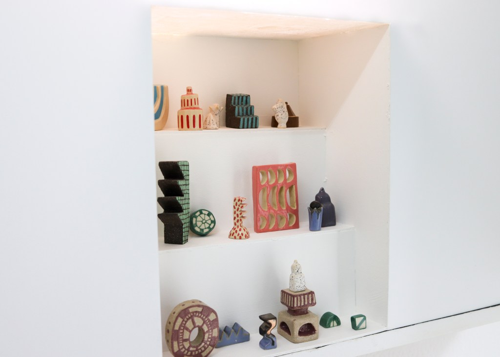 For this exhibition, Mab.ko presented the work Existe uma importância psicogeográfica da cidade, a set of 25 glazed ceramics. This collection of sculptures stems from a practice that seeks to transform fragments of the everyday into objects of aesthetic and sometimes spiritual value.