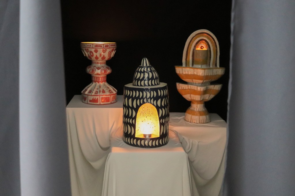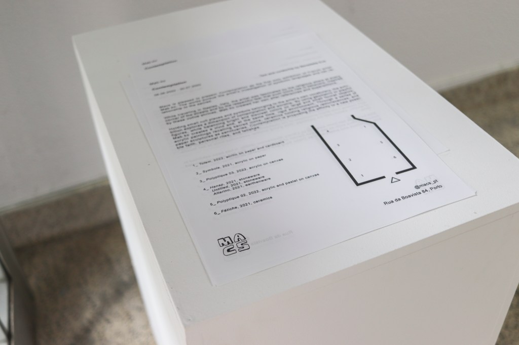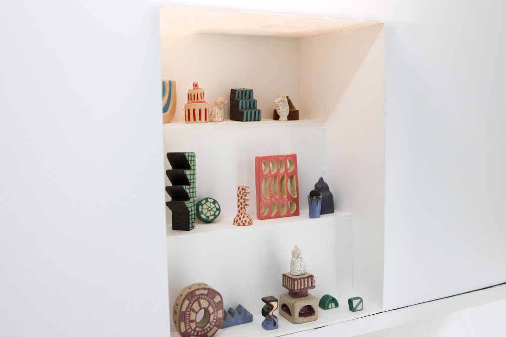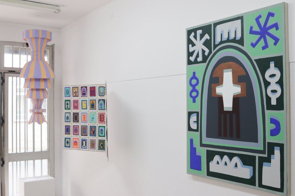 Holding small cult places and symbols belonging to the artist’s own vocabulary, the exhibition explores a dimension of contemplation and worship. By using geometric or playful figures, while balancing bright and discreet colors on large and small format objects, Mab.ko creates a vivid and, at the same time, rigid environment. Through a series of acrylic paintings recalling sacred icons, ceramics holding religious reminiscences, and paper sculptures as sanctuaries, Contemplation is proposing the affinity to a new possible faith, personal rites, and fetishes. »