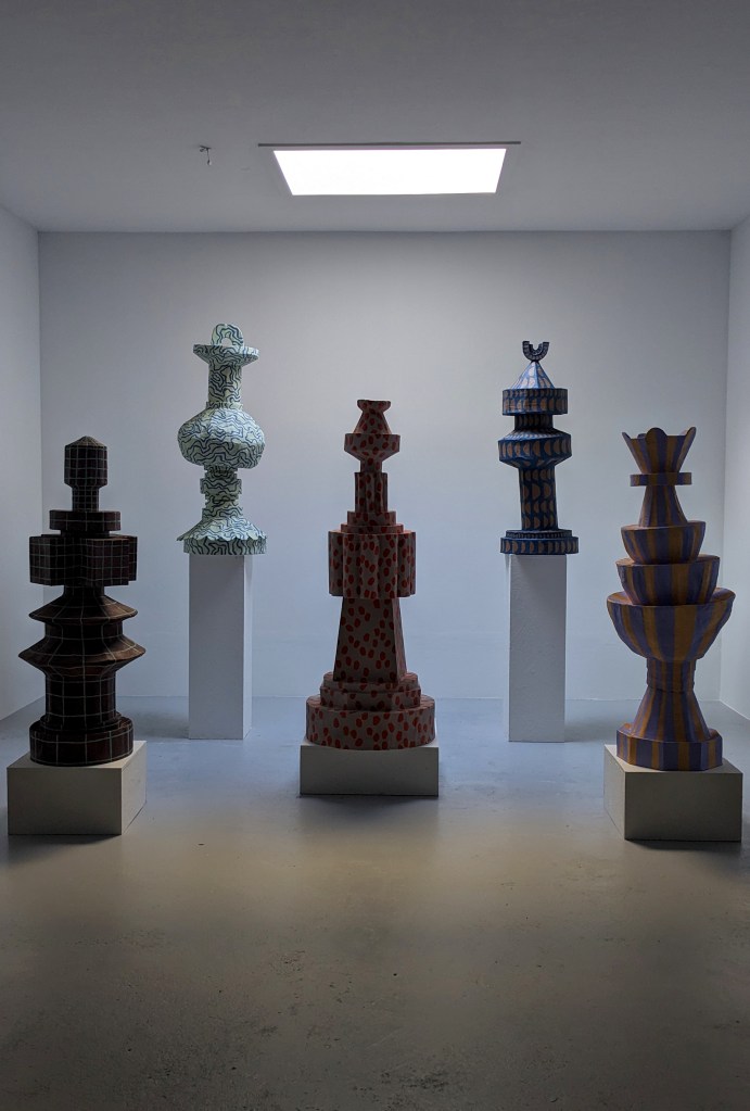 Through a series of acrylic paintings and paper sculptures, the artist invites us into her world of icons and totems to be worshipped. This collection of brightly colored works, with their architectural motifs and repeated symbols, bears witness to the artist’s own mythological language. Using the particularities of space, the artist evokes the atmosphere of rites and sacred practices, and stages works that demand to be felt more than understood.